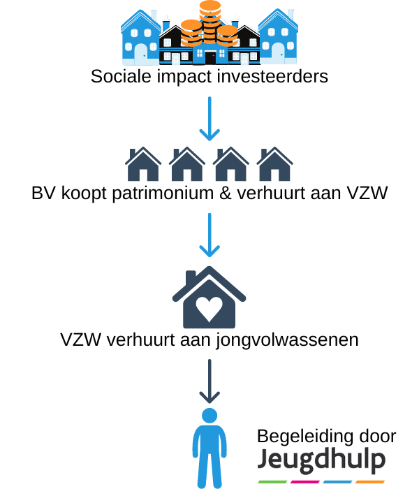 ② Nest Woonrecht VZW zorgt voor de verhuring van dat vastgoed en is ook de intermediair met eigenaars die rechtstreeks aan de jongvolwassenen verhuren.
